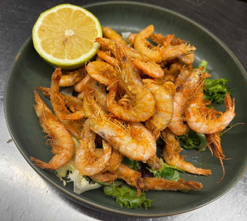 Langostinos cocinados a la brasa con aceite de oliva virgen extra, cayena y ajitos, acompañado de pan a la brasa