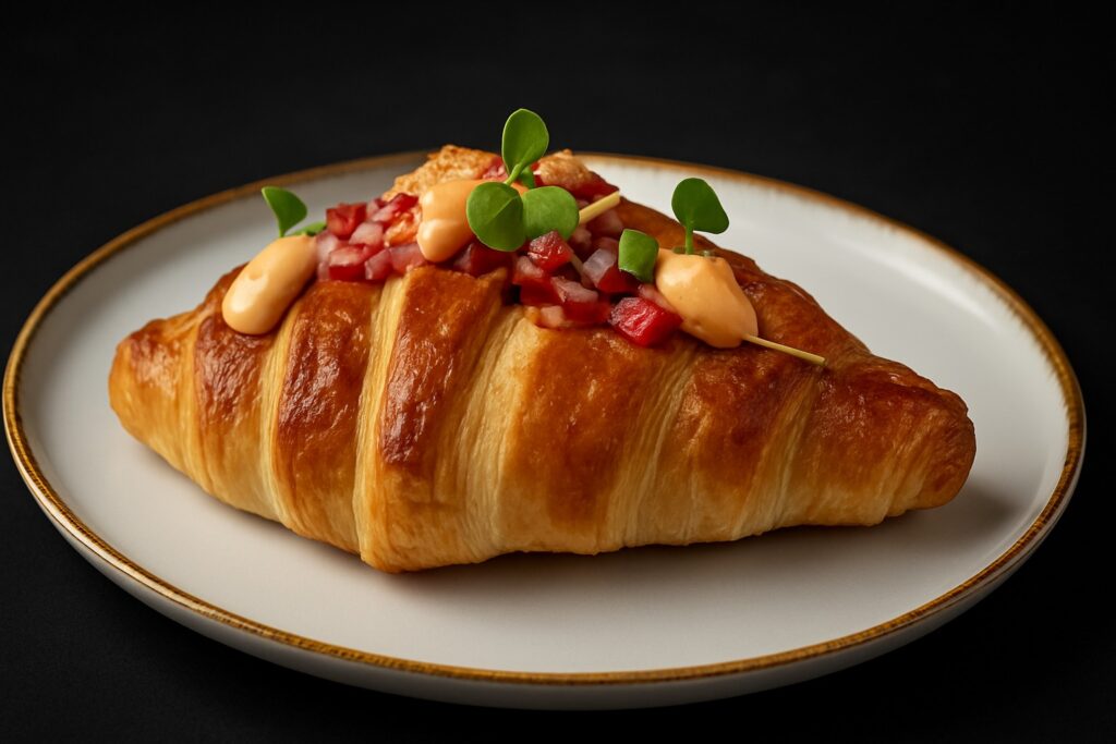Taco con guacamole, pico de gallo, croqueta de cochinita pibil y gota de salsa siracha